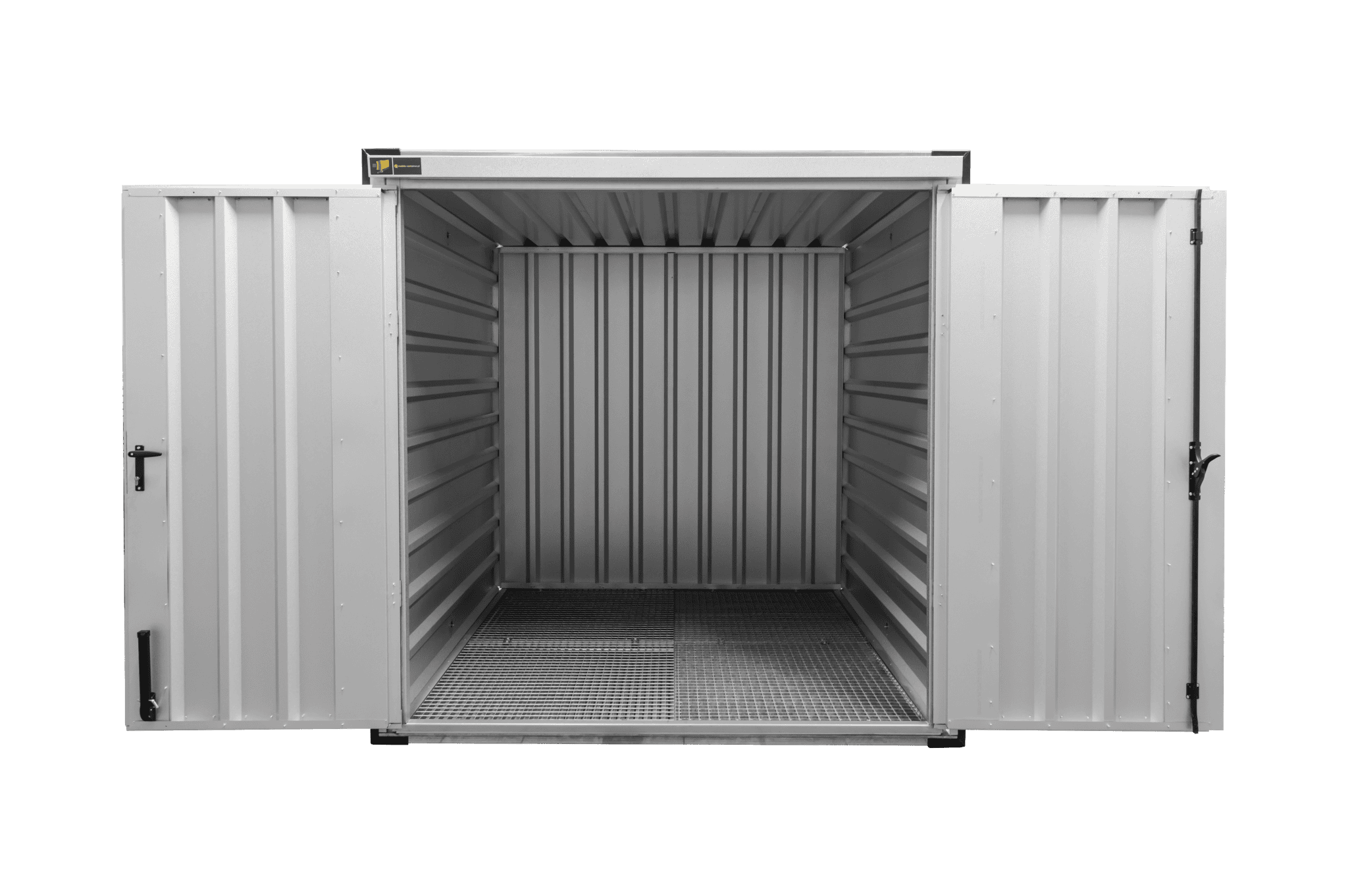 Die Container für Flüssigkeitenlagerung sind mit einer zweiflügeligen Metalltür ausgestattet, die auf einem stabilen Rahmen aus verzinktem Blech montiert ist. Während der rechte Flügel über einen Riegel verfügt, ist der linke Flügel mit einem Fuß, einem Schloss und einem Griff ausgestattet. Diese Lagercontainer sind serienmäßig abschließbar, um Ihre Flüssigkeiten sicher zu verwahren. Die Ablaufrinnen des Containers bestehen aus 0,75 mm dickem Aluzink-Blech, während die Ecken zusätzlich mit 3 mm dickem, korrosionsgeschütztem und lackiertem Blech verstärkt sind.